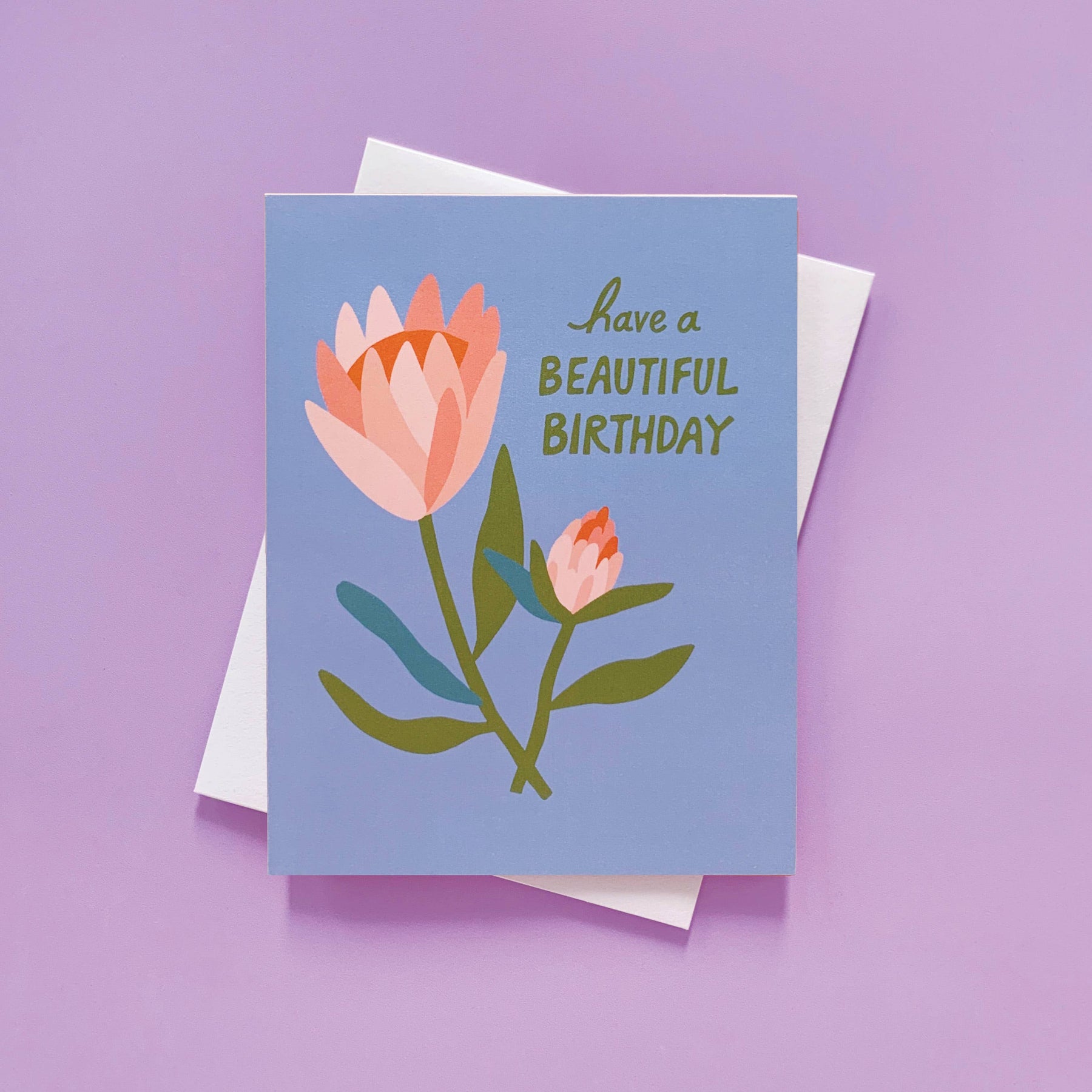 Digitally printed. A2 size card (4.25" x 5.5"), matching envelope. Each card is blank inside and comes in a protective cello sleeve.