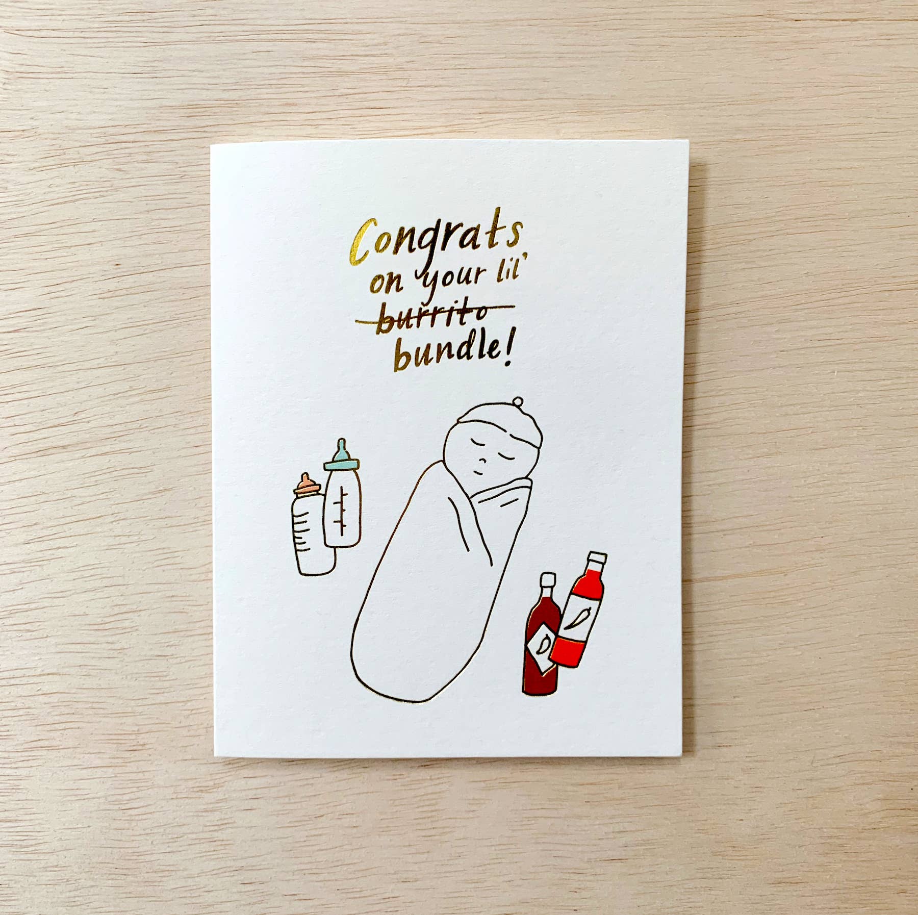 Gold foil + offset printing on recycled paper, A2 size card (4.25" x 5.5"), matching envelope included. Each card is blank inside and comes in a protective cello sleeve.