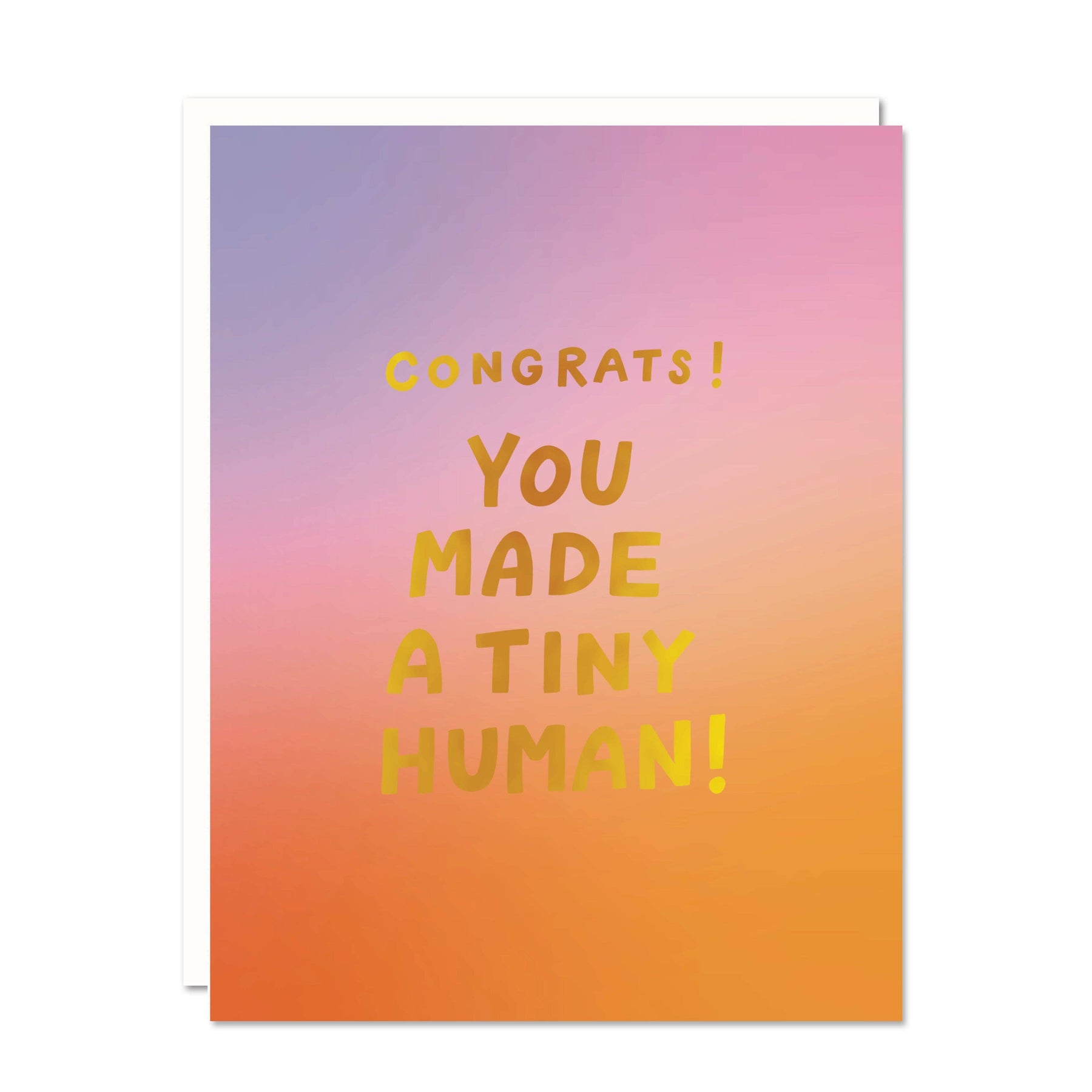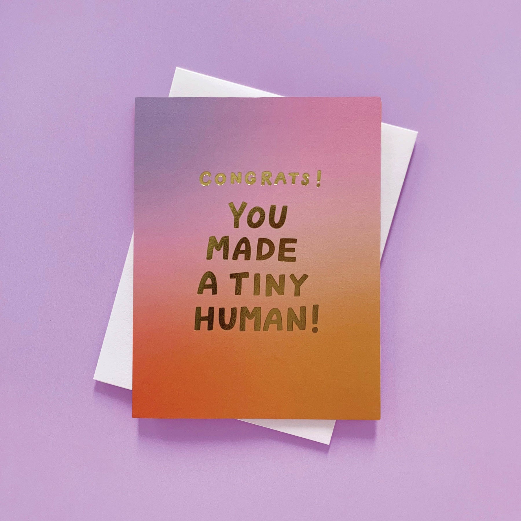 "Congrats! You made a tiny human!" Tiny humans are everywhere these days!! Here's the perfect card to say congrats. Digitally printed with gold foil, A2 size card (4.25" x 5.5"), matching envelope. Each card is blank inside and comes in a protective cello sleeve. Designed by Odd Daughter, made in the USA, and shipped from Albuquerque, NM. Please note: Due to paper shortages, we cannot guarantee the specific cardstock or envelope. In the event that the pictured envelope color is unavailable, another matching envelope will be substituted.